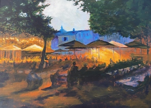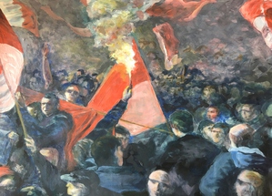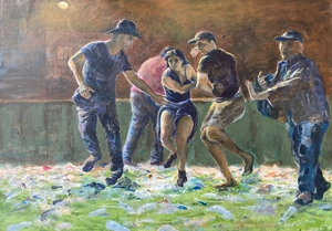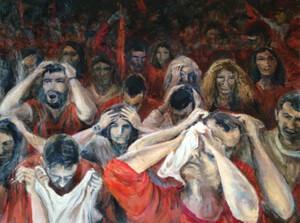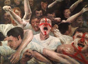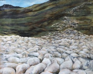 verzamelde mensen, schapen, hooligans, vogels in zwermen, vluchtend of wachtend en wat dat in verf verbindt.