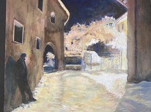 2019Masanti in sneeuw met het licht van een straatlantaarn